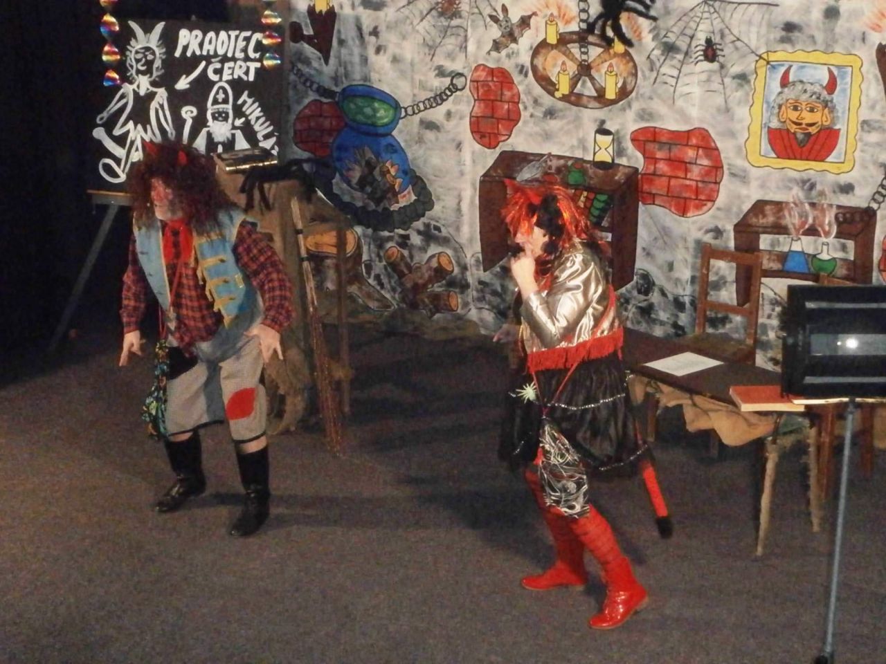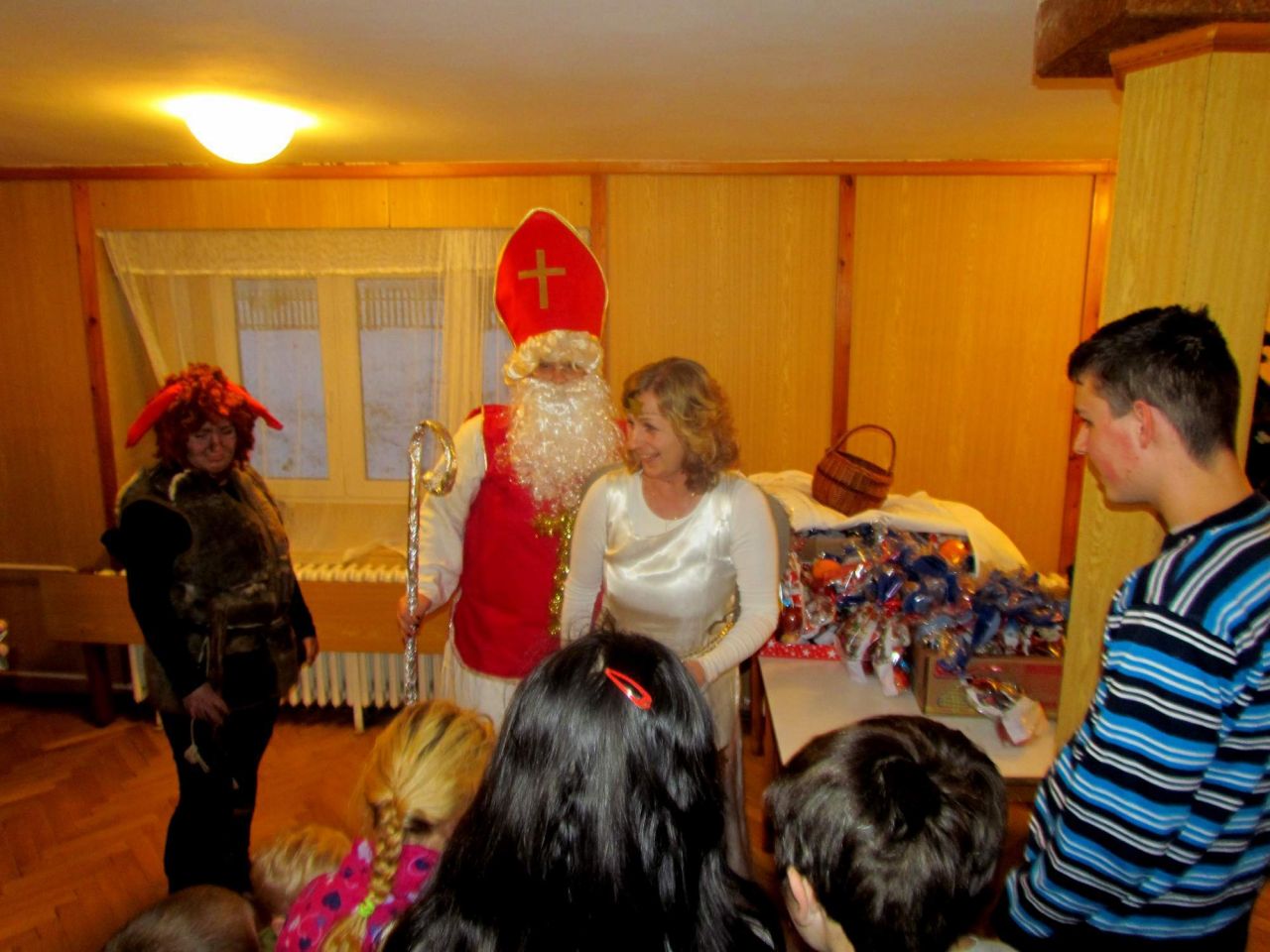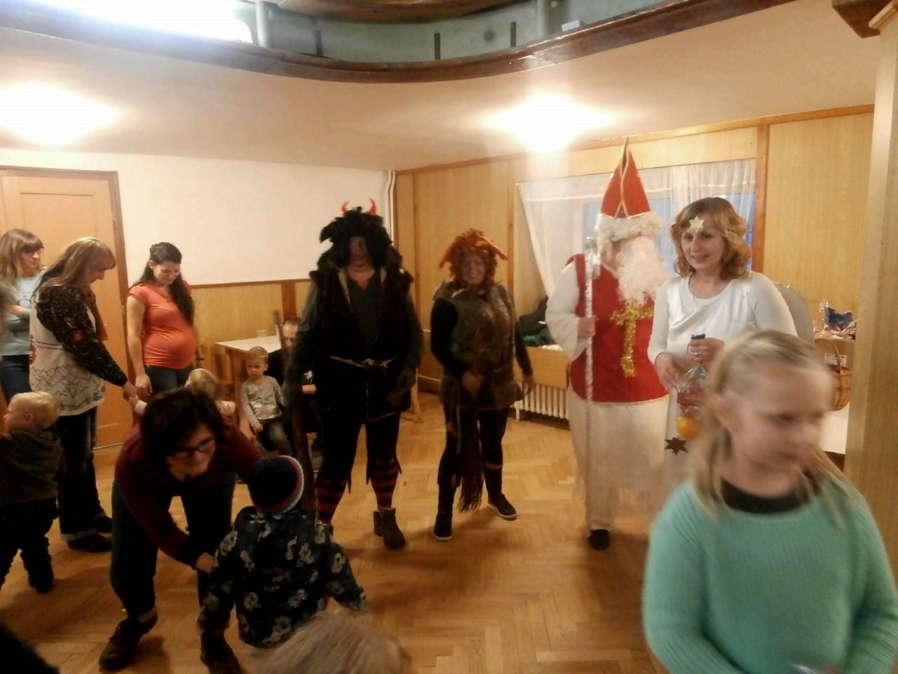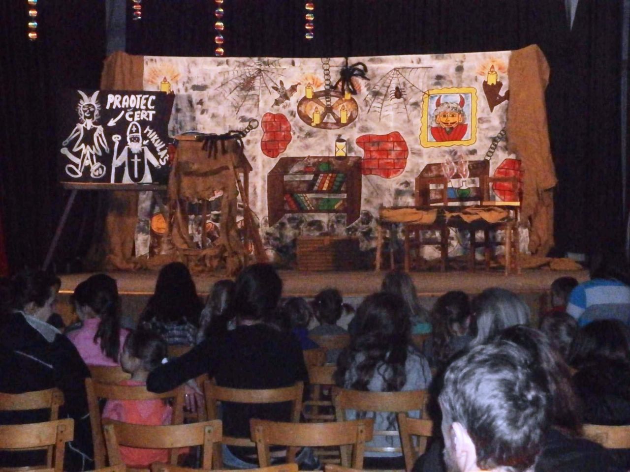 Po představení už děti s napětím očekávaly příchod Mikuláše, místo toho mezi ně vlítli dva čerti, kteří dětem nahnali strach, ale když vstoupil do sálu Mikuláš s andělem a vlídným slovem promluvil k dětem, uklidnili se i hluční čerti. Všechny děti byly Mikulášem obdarovány sladkými pamlsky a ovocem. Ti zlobivější se mohli vykoupit písničkou či básničkou. Čerti je pro jistotu přesto preventivně postrašili, aby na své sliby do příštího roku nezapomněly.