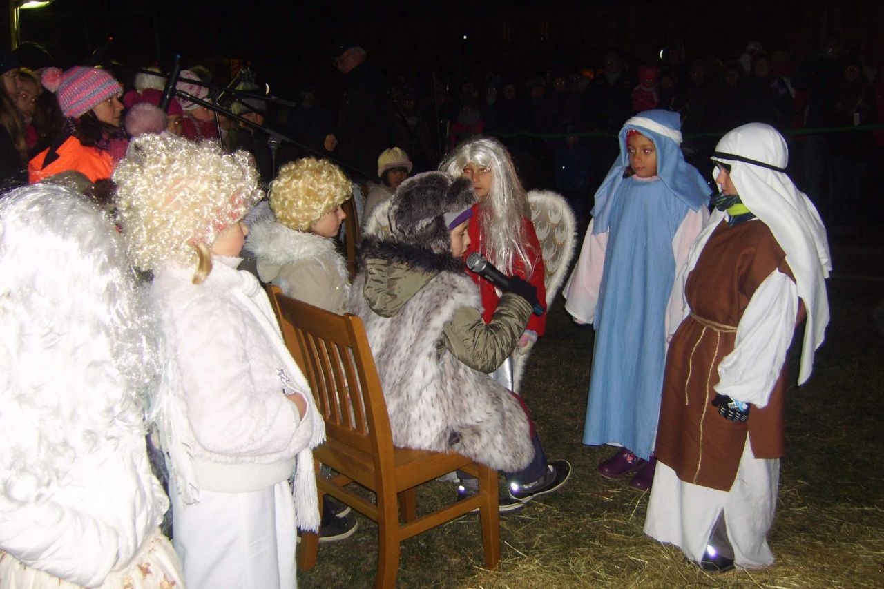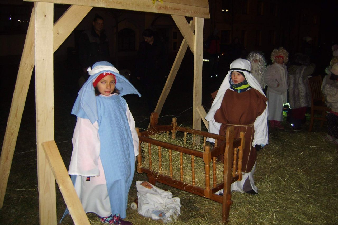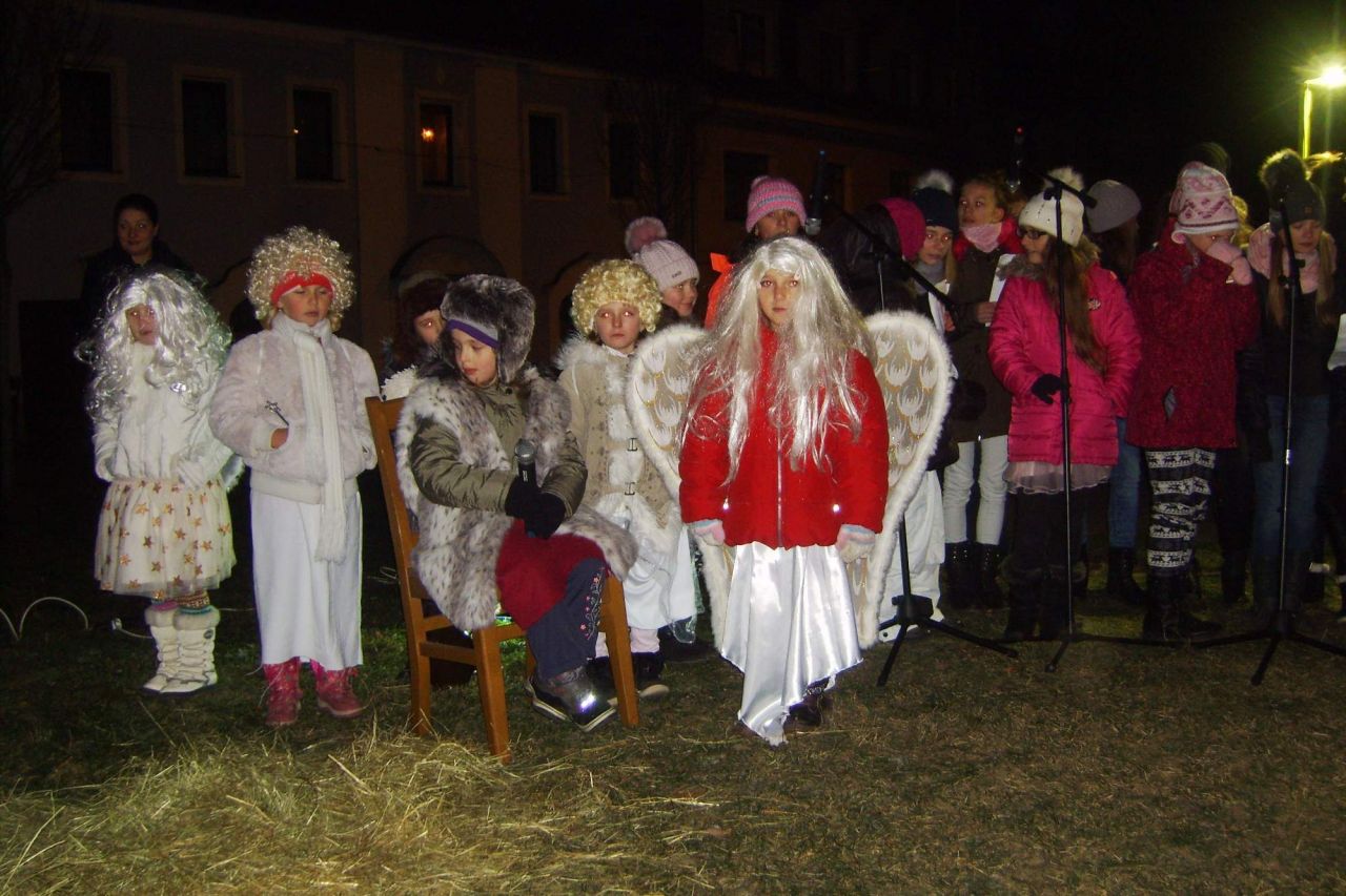 Hlavní program začal v 16.30 vystoupením dětí z MŠ, ZŠ a 2. ZŠ, poté se nám představila děvčátka z dramatického kroužku (DDM K. Vary) se svým prvním hereckým výkonem před veřejností. Novinkou a velkým překvapením byl živý Betlém, který pilně nacvičili žáci 1. třídy ZŠ. Zpěvem koled je doprovázel sbor vedený p. uč. Levanským. Děkujeme všem dětem za krásná a milá vystoupení a pedagogům za trpělivost a čas. Jmenovitě p. uč Písaříkové, p. uč. Černokové, p. uč. Fialce a p. uč. Rehákové.