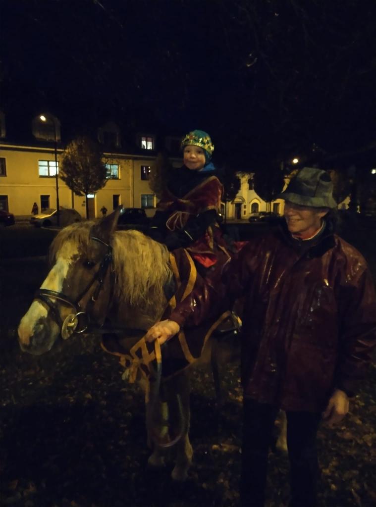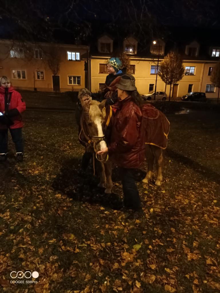 Sobotní odpoledne 11. 11. 2023 začalo v kulturním domě vyprávěním o svatém Martinovi. Ing. Roháč se role vypravěče zhostil skvěle. Po legendě o sv. Martinovi následovalo hádání filmových pohádek, při kterém se děti velice zdatně zapojovaly. Po vyprávění jsme odměnili nejhezčí doma vyrobené lampióny. Poté se program změnil na dětskou diskotéku, kterou provázely hry, aby si děti ukrátily čekání na svatého Martina na koni, kterého nám propůjčil pan Ivo Kočík z Jezdecké stáje Kočík Stružná. Svatomartinský lampiónový průvod šel od kulturního domu směrem k pile a končil na náměstí. I přes velmi deštivé počasí byla účast hojná. Na závěr jsme před radnicí společně vytvořili spirálu štěstí.