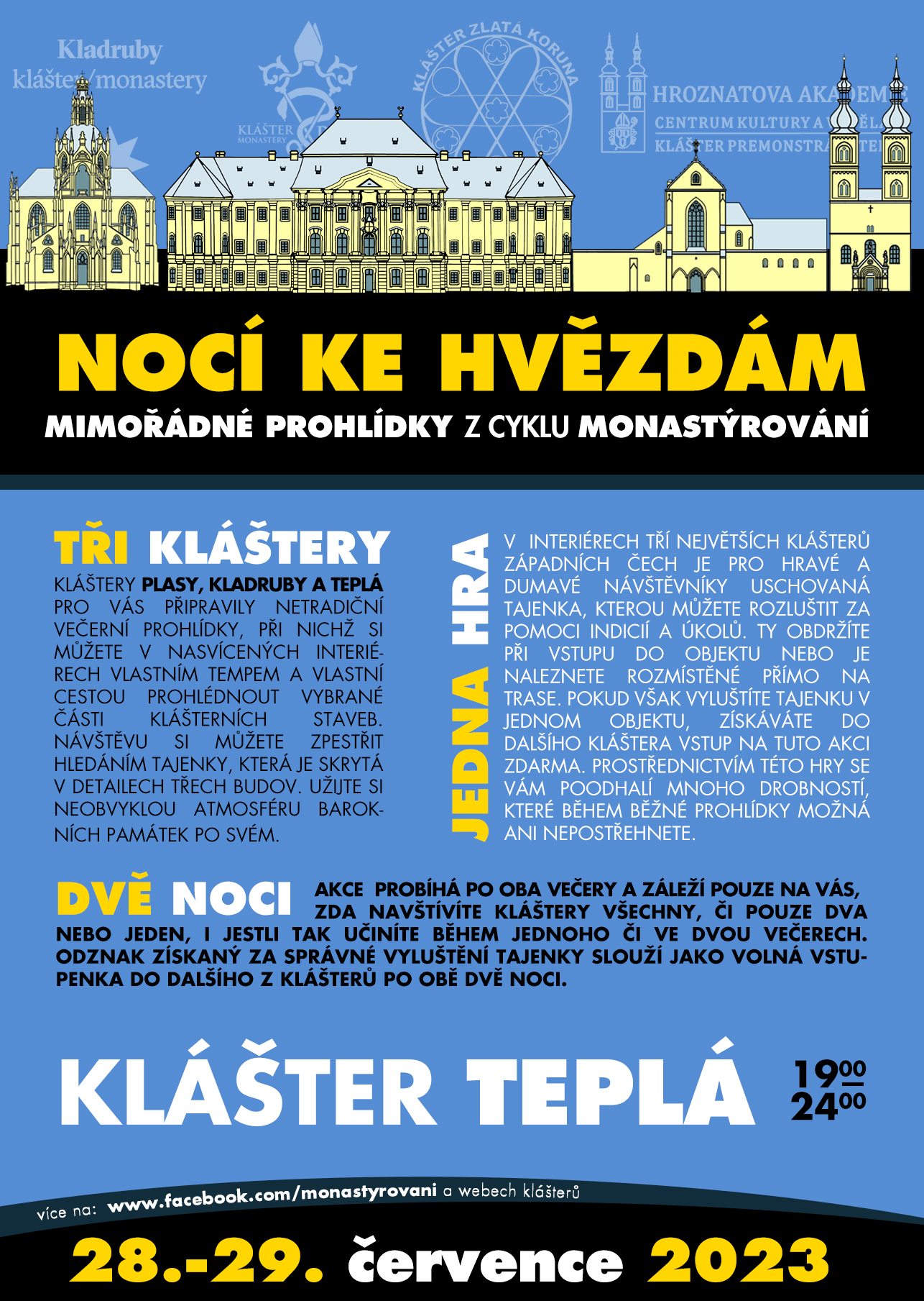 Mimořádné prohlídky z cyklu Monastýrování ve dnech 28.-29.7.2023 od 19:00 do 24:00 hodin v klášterech Plasy, Kladruby a Teplá