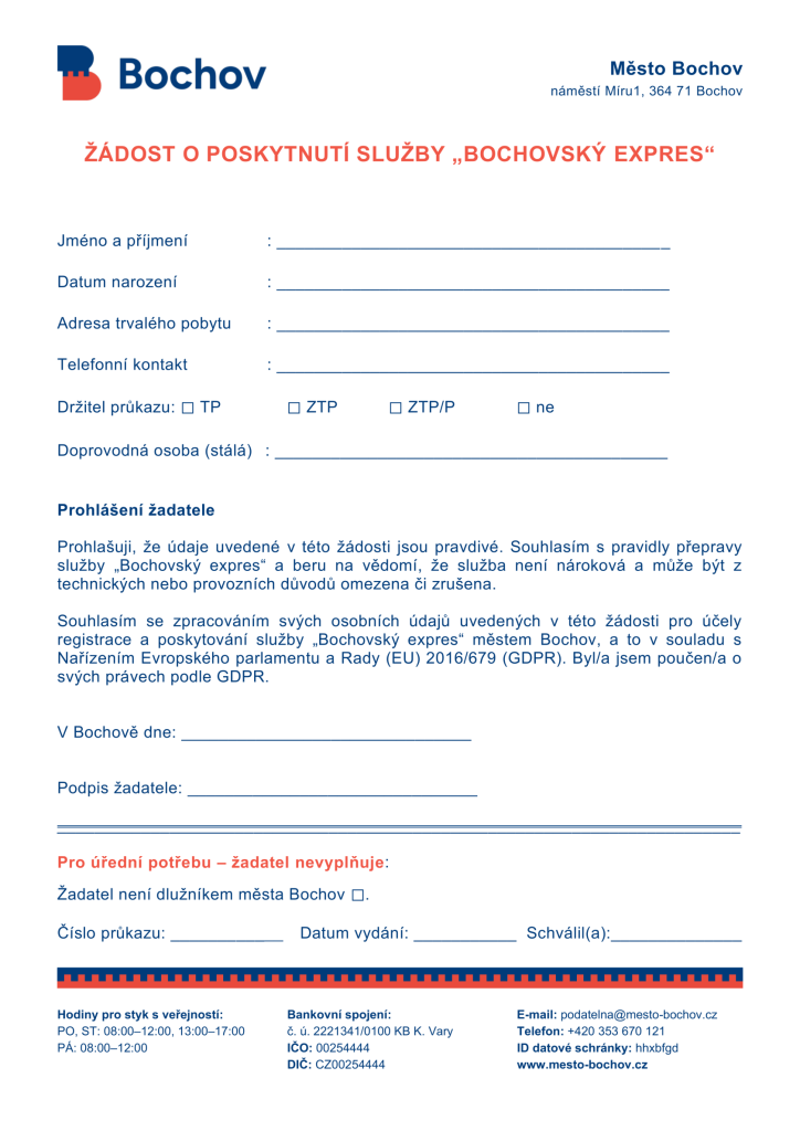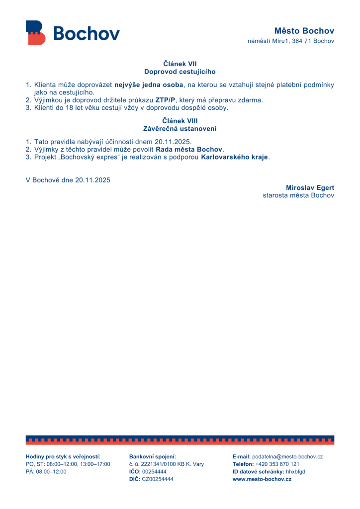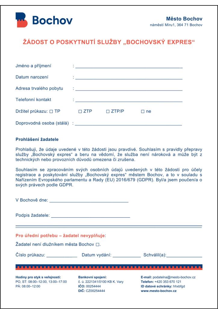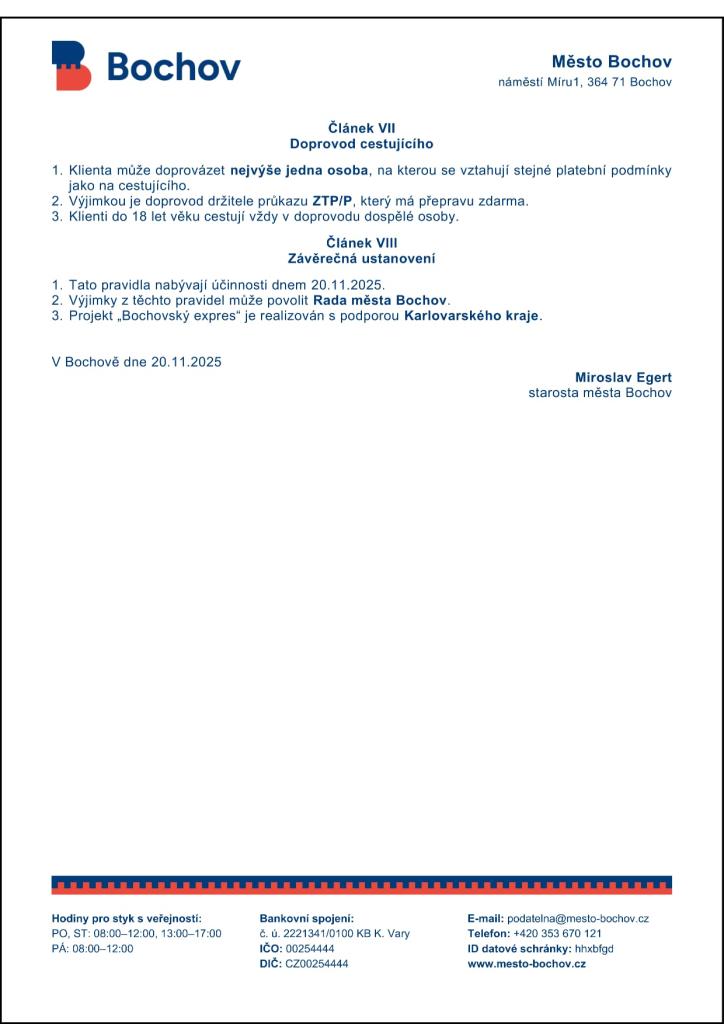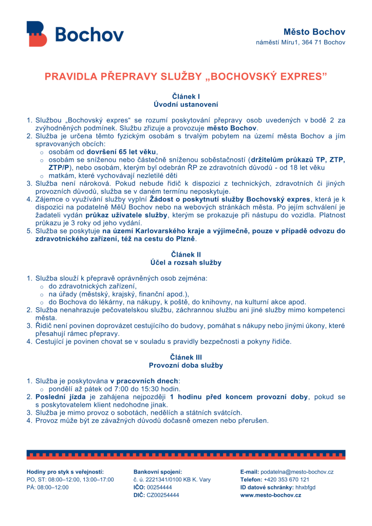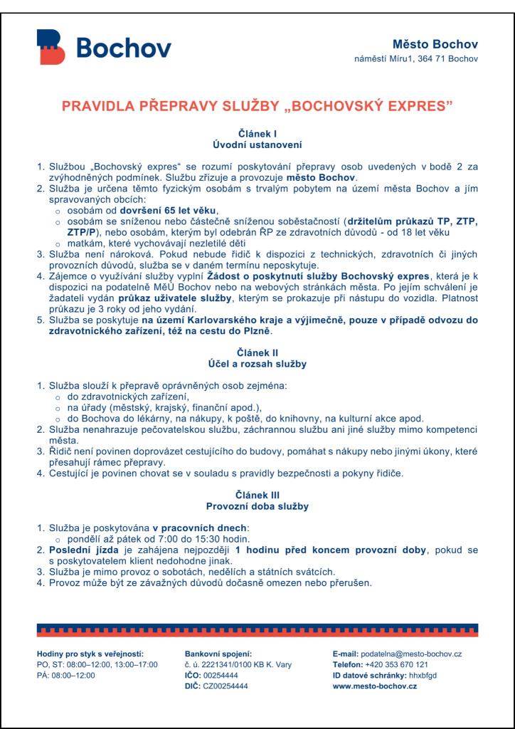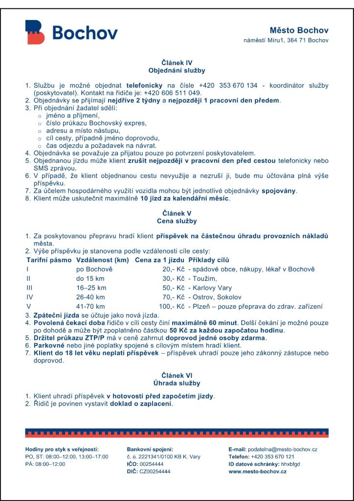 Více viz přiložená Pravidla přepravy služby „Bochovský expres“ a Žádost o poskytnutí služby „Bochovský expres“