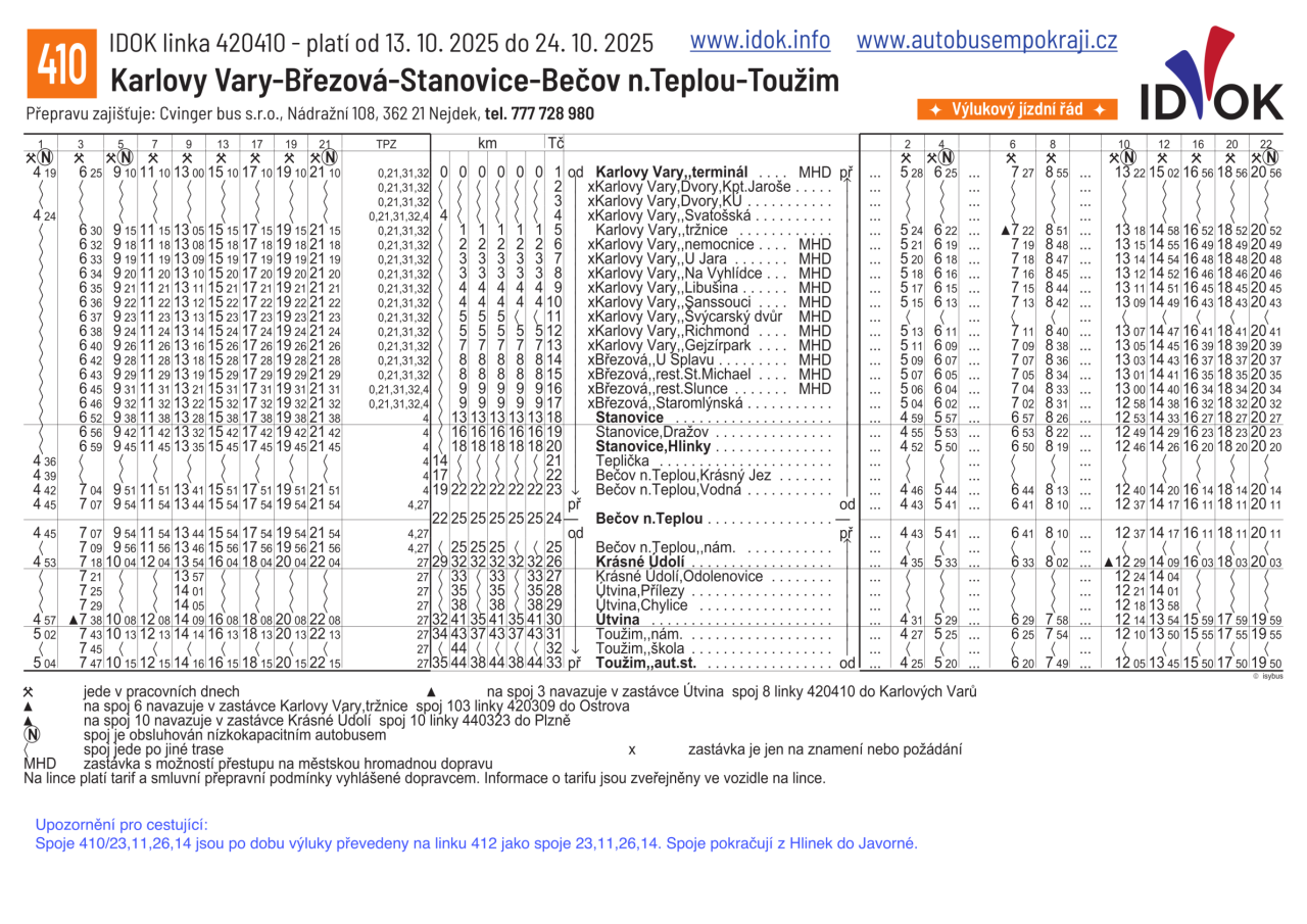 Výlukový jízdní řád linky 420410 s platností od 13.10.2025 do 24.10.2025: