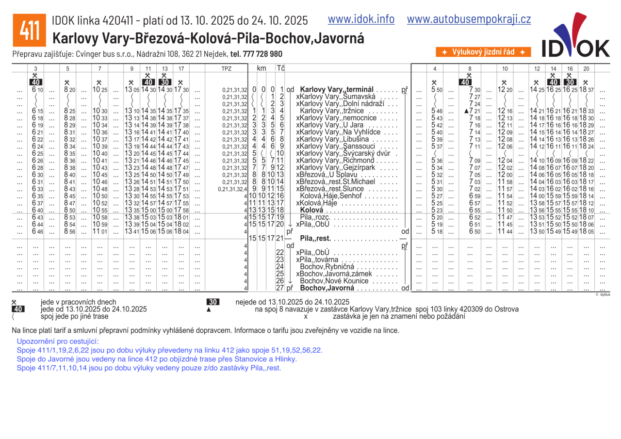 Výlukový jízdní řád linky 420411 s platností od 13.10.2025 do 24.10.2025: