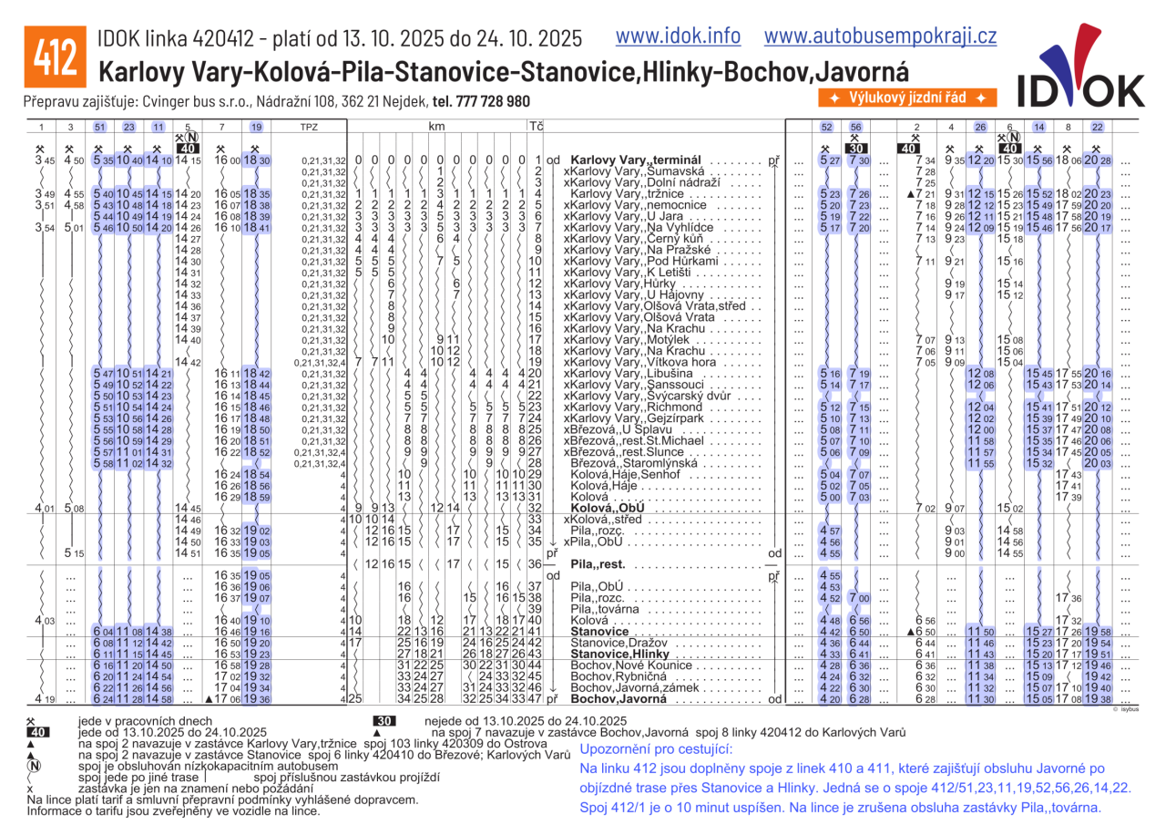Výlukový jízdní řád linky 420412 s platností od 13.10.2025 do 24.10.2025: